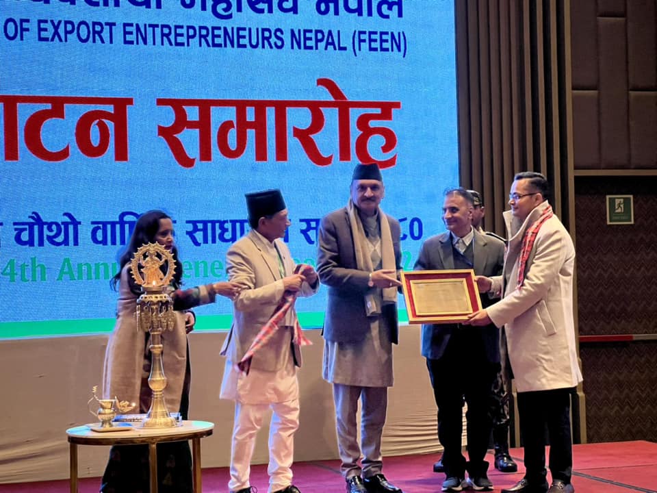 As the top exporter(2079/80) of Nepali herbs and herbal products (Essential oil), we are happy to receive the certificate from the Hon'ble Finance Minister Dr. Prakash Saran Mahat. We want to thank all the farmers, colleagues, family, friends, and buyers who have helped Annapurna Aroma in this success.